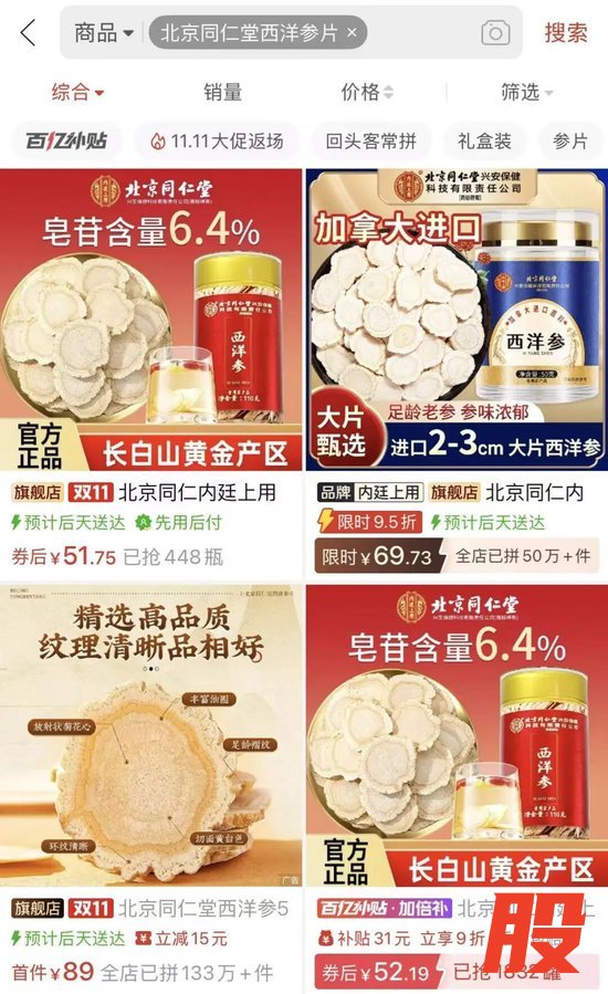 在拼多多上,销量排在首位的是“北京同仁堂兴安保健”出品的一款西洋参片,商家为“内廷上用健康旗舰店”,这款西洋参片外包装同样为红色瓶身,规格却是110g,单瓶价格为51.75元。销量排在第二的是一款蓝色瓶身、规格为50g的进口西洋参片,出品方同样为“北京同仁堂兴安保健”,商家为“内廷上用滋补养生旗舰店”,单瓶价格为73.4元。