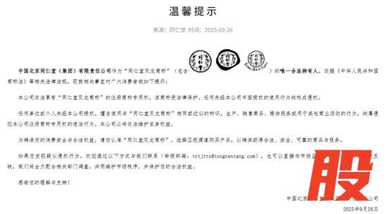 2024年8月,该集团发布声明称,“从未允许下属公司使用‘同仁堂’商标、字号及任何含有‘北京同仁堂’‘同仁堂’字样的标识,对外开展招商加盟活动,该类合作、加盟、宣传、销售行为均与我公司无关。”今年9月,该集团又提到其依法享有“同仁堂双龙商标”的注册商标专用权,任何未经授权擅自使用的行为均属于侵权行为。