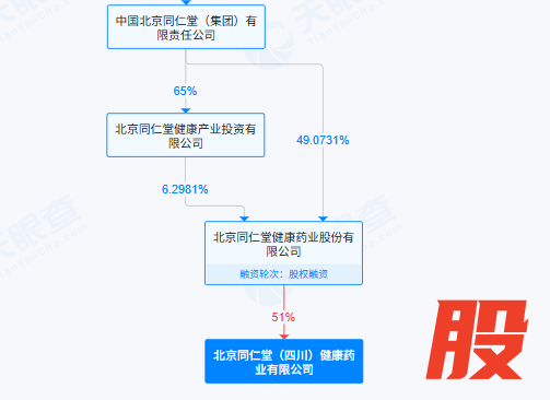 北京同仁堂(四川)药业的控股股东为北京同仁堂健康药业股份有限公司,持股比例51%,后者同样为北京同仁堂集团的孙公司。天眼查显示,目前北京同仁堂集团直接持股49.0731%,并通过北京同仁堂健康产业投资有限公司间接持股6.2981%。